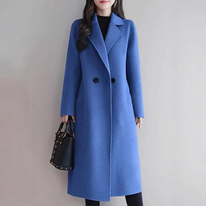 跨境欧美秋冬新品女士复古优雅双排扣蓝色毛呢大衣西装领修身外套