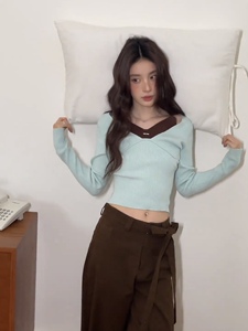 法式薄荷绿撞色v领针织长袖t恤女2025秋季内搭修身显瘦打底衫上衣