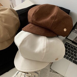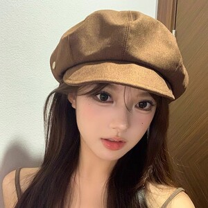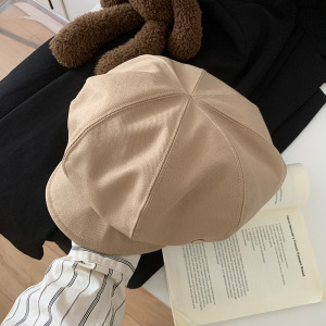 简约咖色八角帽女春秋日系复古百搭贝雷帽大头围显脸小画家帽子潮