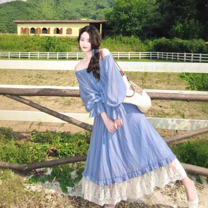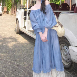 法式蓝色一字肩田园风连衣裙女秋季长袖高级感气质露肩宽松长裙女