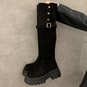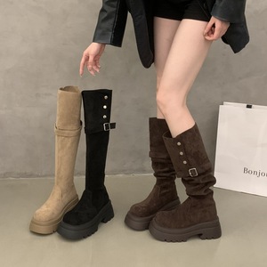 韩版时尚俩穿翻折厚底长筒靴子女2025秋冬新款粗跟过膝骑士靴