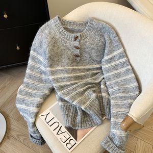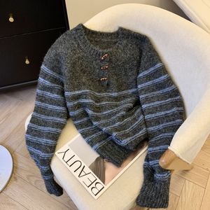 糯秋冬慵懒风套头外套条纹圆领毛衣女软宽松针织上衣粗毛线牛角扣