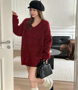 红色v领亮片毛衣女2025新年款精致设计小众宽松慵懒风针织衫上衣