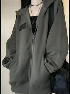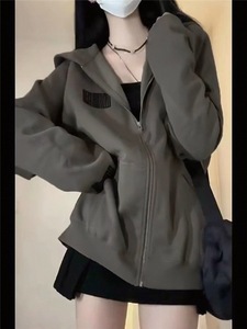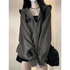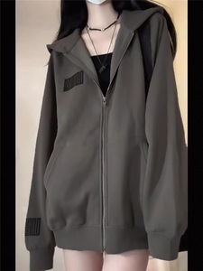 韩系拉链式外套女2025年春秋季新款美式复古深灰色中长款连帽卫衣