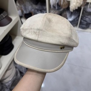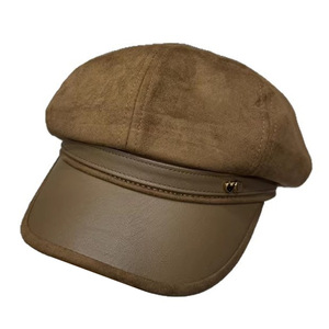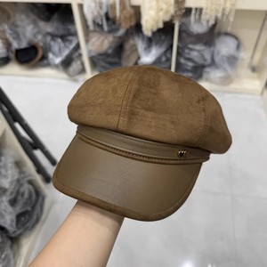 韩国爱心标八角帽女2025复古百搭画家帽秋冬麂皮绒拼接皮檐鸭舌帽
