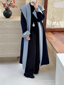爆款浴袍双面羊毛羊绒大衣长款双面色蓝色连帽系带加厚韩系女外套