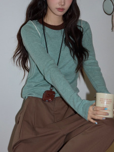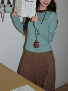 复古绿色圆领针织衫女2025秋新款高级气质修身显瘦长袖上衣