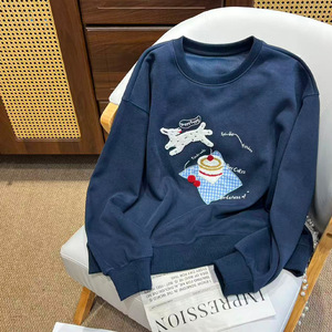 无帽卡通印花圆领落肩卫衣女2025新款秋季暮冬绒圆领刺绣长袖上衣