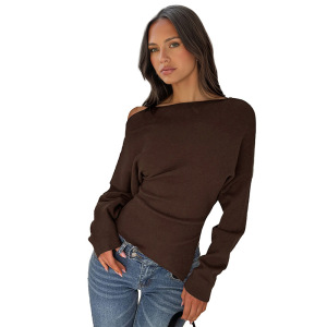 C25TP134 欧美女装秋季亚马逊新款纯色斜领收腰开叉长袖T恤上衣女
