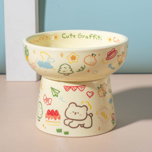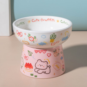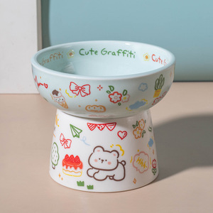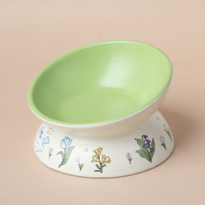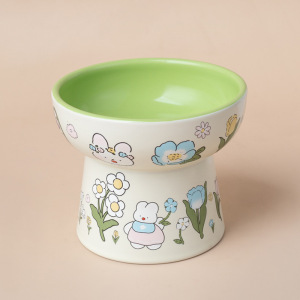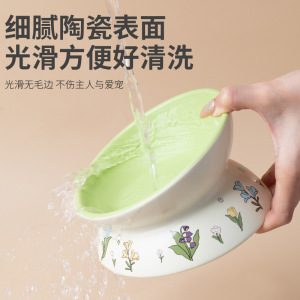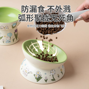 陶瓷猫碗可爱花边绿兔子水碗套装猫罐头食盆陶瓷斜口防打翻狗粮碗