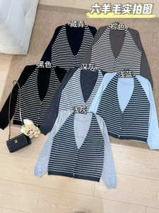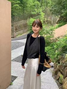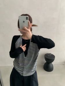 韩系V领条纹针织开衫挂脖背心女2025早秋新款叠穿长袖上衣假两件
