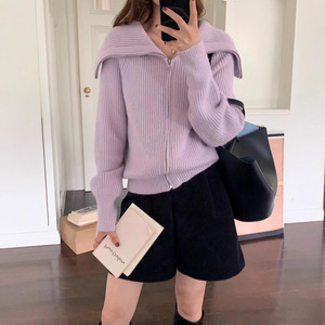 跨境欧美双拉链海军领毛衣女2025秋冬宽松慵懒风针织开衫外套上衣