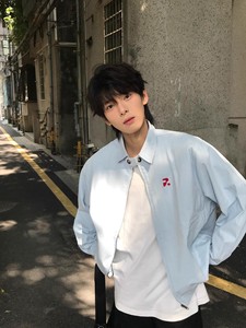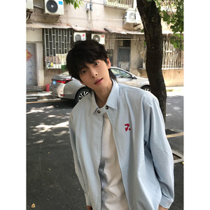 美式高街蓝色翻领工装外套男款秋季宽松休闲情侣装青少年夹克上衣