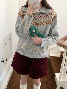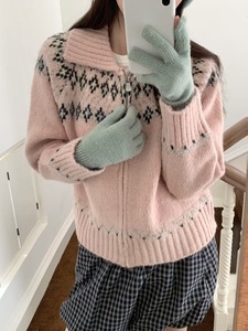 秋冬复古费尔岛翻领拉链毛衣外套女宽松外穿慵懒洋气针织开衫上衣