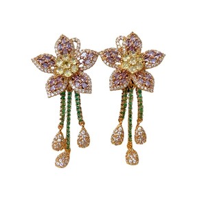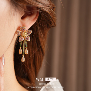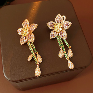 18k真金电镀锆石花朵耳环小众设计复古吊坠流苏耳钉中古气质耳饰