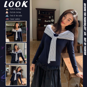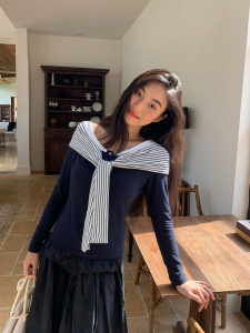 韩系学院风条纹绑带长袖T恤女秋季新款设计感修身显瘦假两件上衣