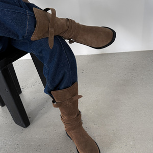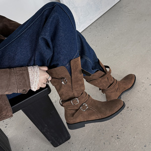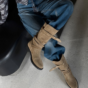 又美又酷!法式慵懒风复古西部牛仔靴2025圆头低跟皮带扣马丁短靴