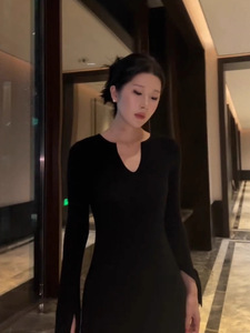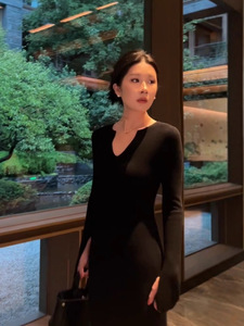 【现货】赫本风法式黑色长袖v领连衣裙秋季新款气质修身显瘦长裙