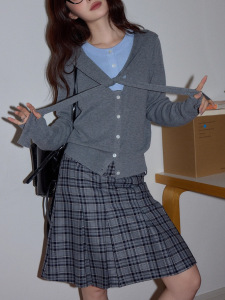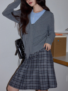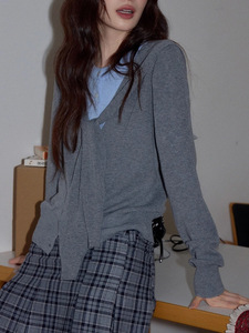 灰色假两件长袖针织衫女士薄款2025新款高级感上衣早秋氛围感穿搭