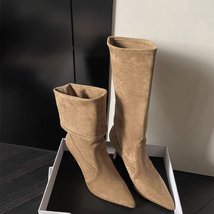百搭短筒堆堆靴细跟高跟西部牛仔靴短靴女杏色显瘦时装中筒单靴子