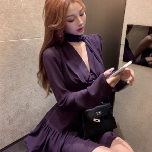 紫色v领长袖雪纺连衣裙女早秋修身气质短裙御姐轻熟风收腰a字裙子