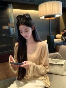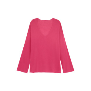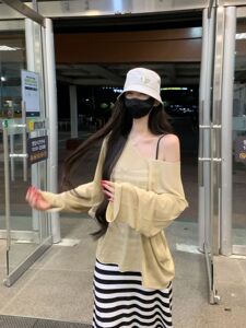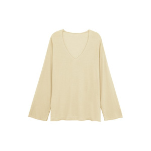 纸片人慵懒风露肩v领长袖t恤女夏季薄款天丝亚麻混纺宽松针织上衣
