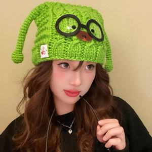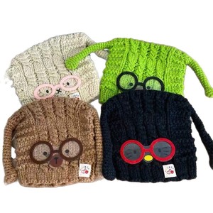 批发手工编织可爱眼镜小狗针织套头帽女秋冬保暖护耳毛线帽包头帽