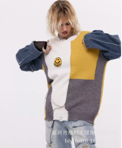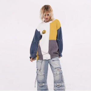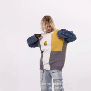 跨境欧美宽松毛衣女设计感小众牛仔拼接外穿上衣慵懒风针织打底衫