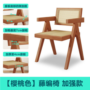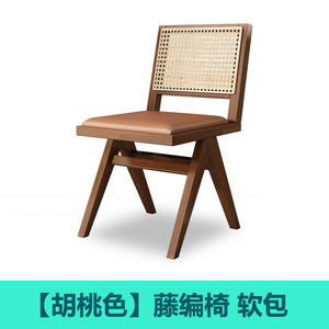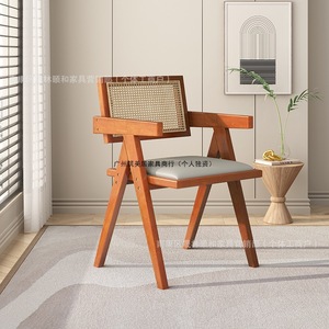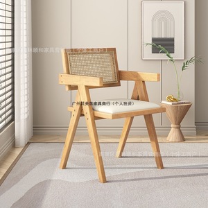 北欧实木餐椅藤编椅子昌迪加尔椅软包藤编扶手椅靠背椅侘寂风椅子