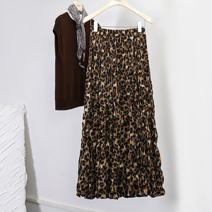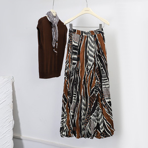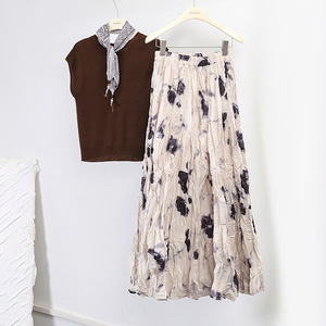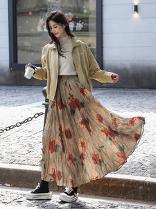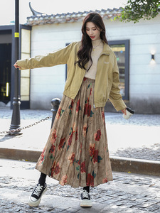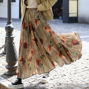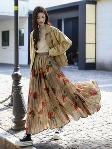 菲媛秋冬新款垂感褶皱A字印花百褶裙 复古晕染玫瑰花大摆半身裙女