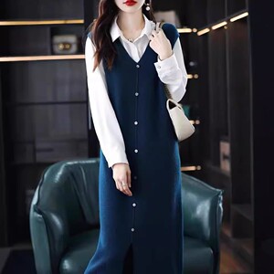 纽扣开叉设计秋冬外穿毛衣裙女日韩百搭V领宽松中长款针织背心裙