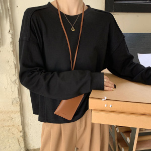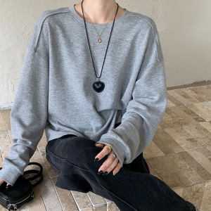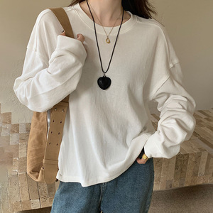 棉质秋季新款圆领长袖T恤女2025宽松百搭显瘦慵懒风纯色打底上衣