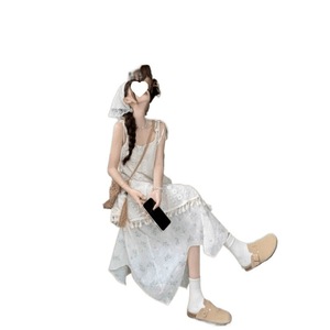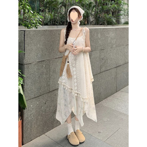 海边度假风假两件吊带连衣裙女夏气质仙印花流苏不规则沙滩长裙
