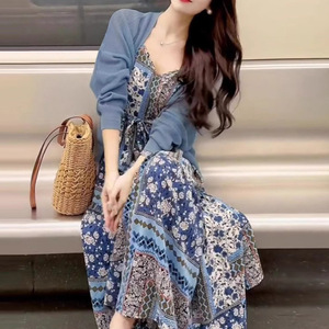 【两件套】高级感好看法式绝美蓝色开衫碎花吊带显瘦连衣裙套装