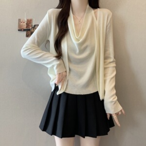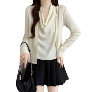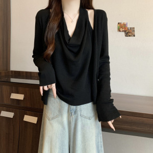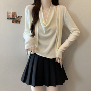 大码假两件荡领挂脖长袖针织衫女2025秋装慵懒风设计感显瘦上衣