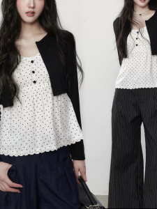 誉芝yuzhi 高级感简约秋季波点设计V领修身显瘦假两件长袖上衣女