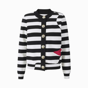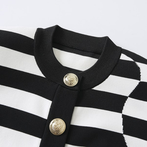 2025春秋下新款黑白拼色条纹修身显瘦精致珍珠扣圆领针织开衫女