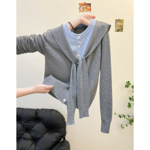 2025秋款韩版复古简约纯色假两件羊毛针织衫女气质设计感长袖上衣