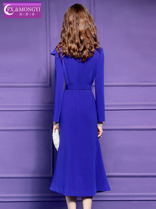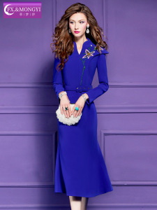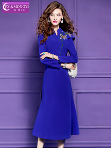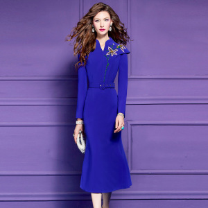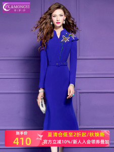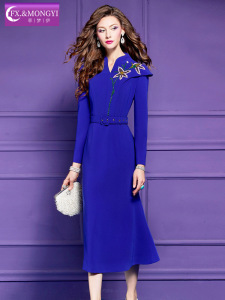 菲梦伊原创绣花蓝色连衣裙女秋装新款高贵优雅洋气收腰职业中长裙