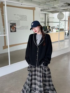 韩系黑色翻领针织外套女2025秋冬季新款软糯毛衣开衫宽松慵懒上衣