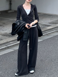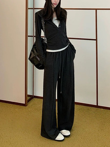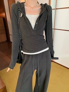 sporty chic*磨毛连帽假两件t恤卫衣抽绳休闲裤套装女秋