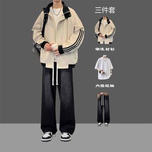 三件套设计感夹克潮流男春秋帅气棒球服套装大学生搭配牛仔裤穿搭