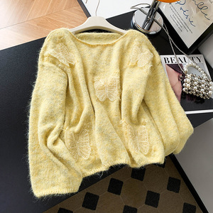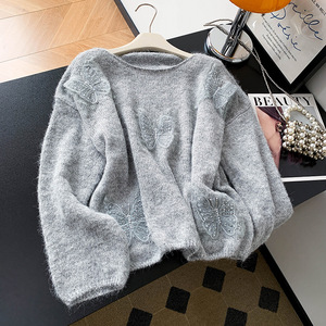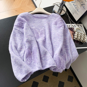 实拍立体蝴蝶钉珠紫色毛衣女秋冬大码胖妹妹韩系慵懒高级感针织衫