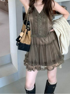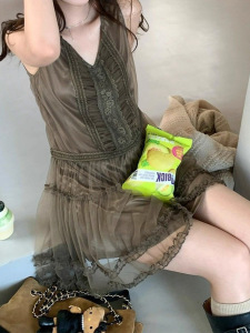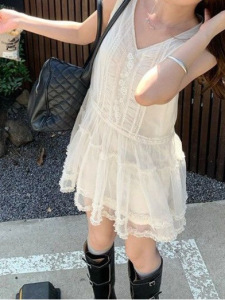 蕾丝气质夏秋法式设计师复古少女纯欲连衣裙叠穿花边甜美网纱V领