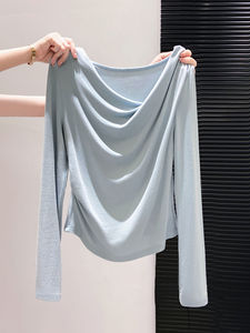温柔风奶杏色斜肩荡领长袖T恤女春秋季显白不规则打底衫上衣内搭