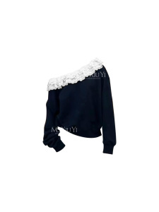 现货藏青色斜肩卫衣女2025新款蕾丝花边小众长袖上衣