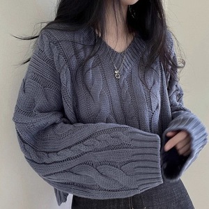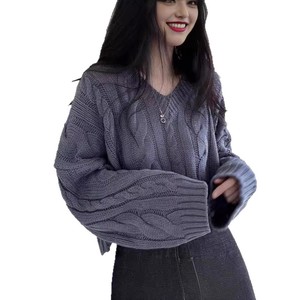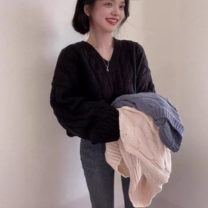 2025复古麻花V领套头长袖毛衣女秋冬新款宽松短款慵懒风针织上衣