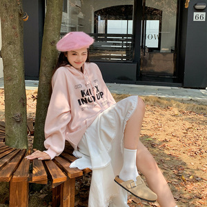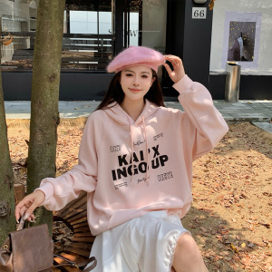 温柔甜美浪漫氛围感卫衣粉色字母印花宽松型连帽卫衣 加绒加厚女