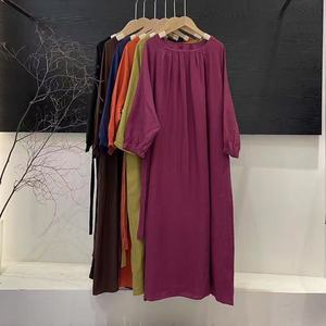 25年秋装文艺亚麻连衣裙长袖圆领捏褶领口宽松慵懒显瘦长裙袍子女