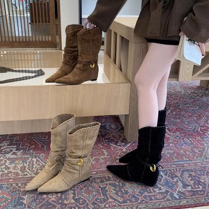 内增高尖头绒面瘦瘦中筒骑士靴女靴子2025秋冬季西部牛仔堆堆长靴